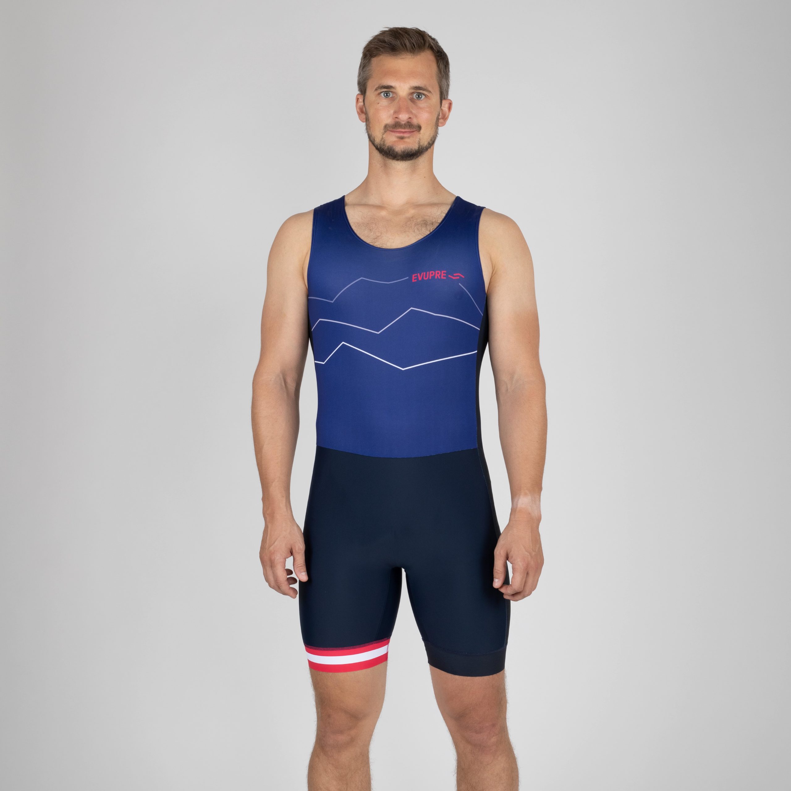 Slim fit (skinny): Model Alexander measures 180 cm and wears size M. Slim fit (skinny): When designing our PRO Racer Austrian Rowing Fan, we aimed for a skin-tight fit. If you feel uncomfortable with a skin-tight fit, we recommend selecting a size up. The leg length is slightly shorter than in comparison with the Men’s racer. The shoulder straps sit discreetly on the front, whilst the lower back neckline allows for freedom of breathing while being a real eye-catcher.