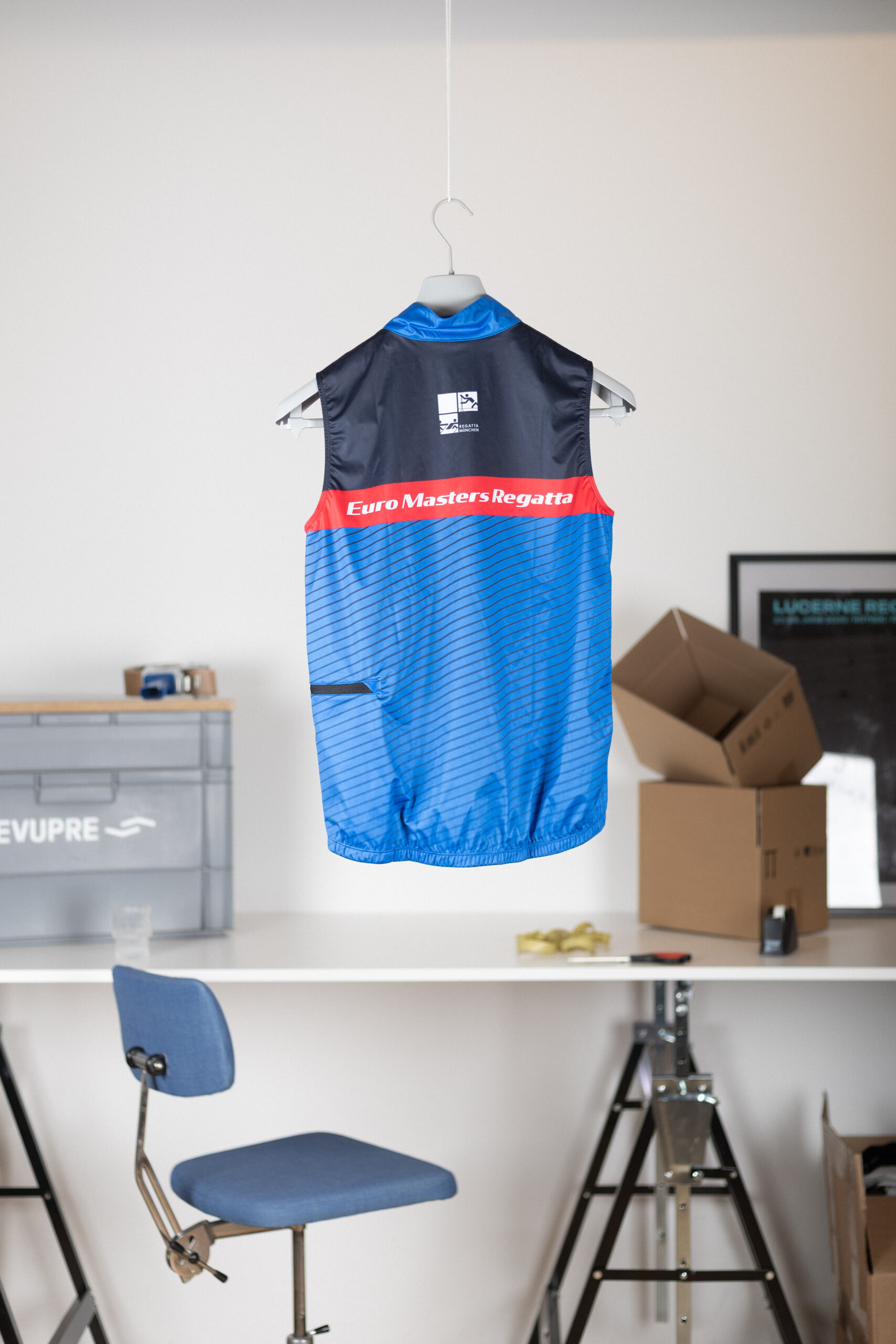 The vest comes in red, blue, black, and white. The design integrates the legendary symbols of the rowing competitions from the 1972 Munich Olympics, along with the EMR logo and the event’s location.