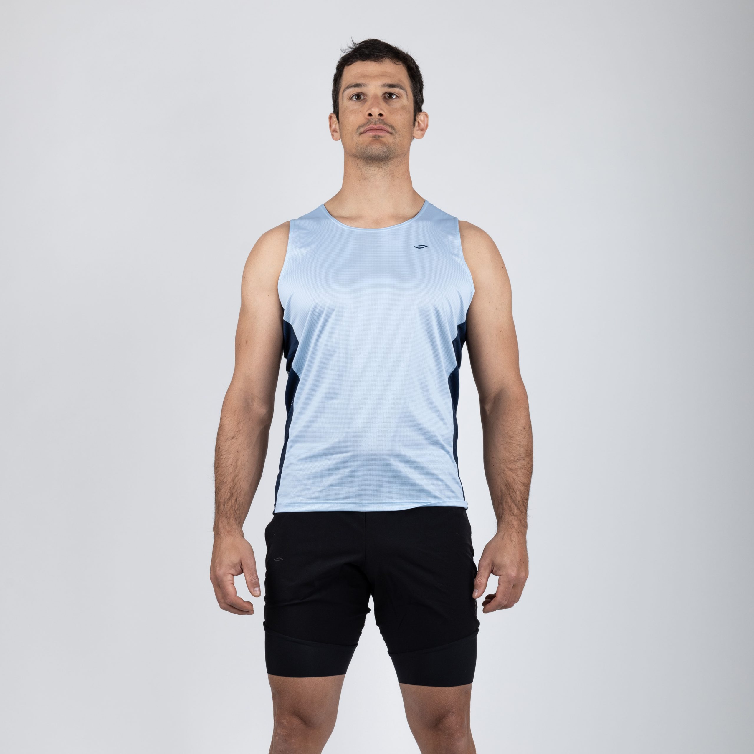 Le modèle Florian mesure 190 cm et porte la taille XL. Le haut sans manches Pro est disponible en coupe normale. Les coutures plates assurent un grand confort au porteur avec un look élégant et sportif. La partie arrière est 3cm plus longue que la partie avant pour assurer que le bas du dos est couvert même en position de capture.