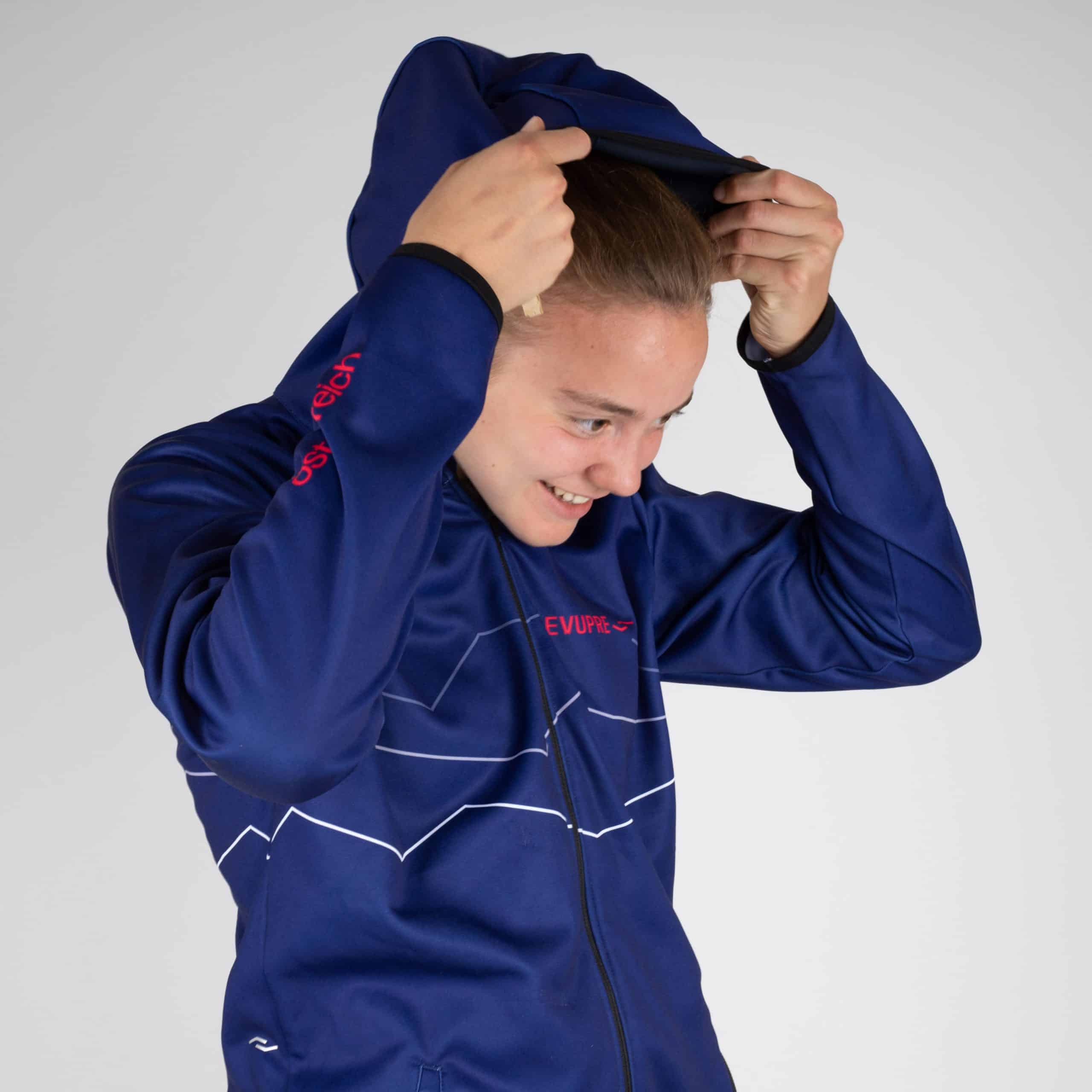 The Pro Zip Hoodie Austrian Rowing Fan Women comes in a juicy blue color, same as the Pro Racer Austrian Rowing Fan Women and the Pro Vest Austrian Rowing Fan Women. Contrasting the blue, we added the lettering ‘Austria’ on the back in the same bright red as the EVUPRE logos.