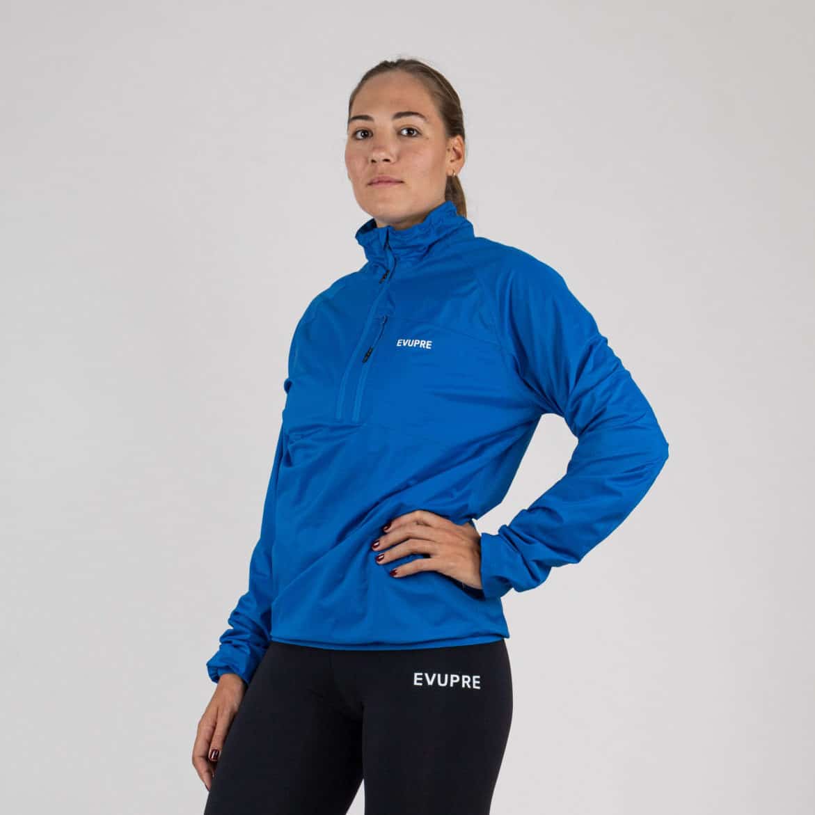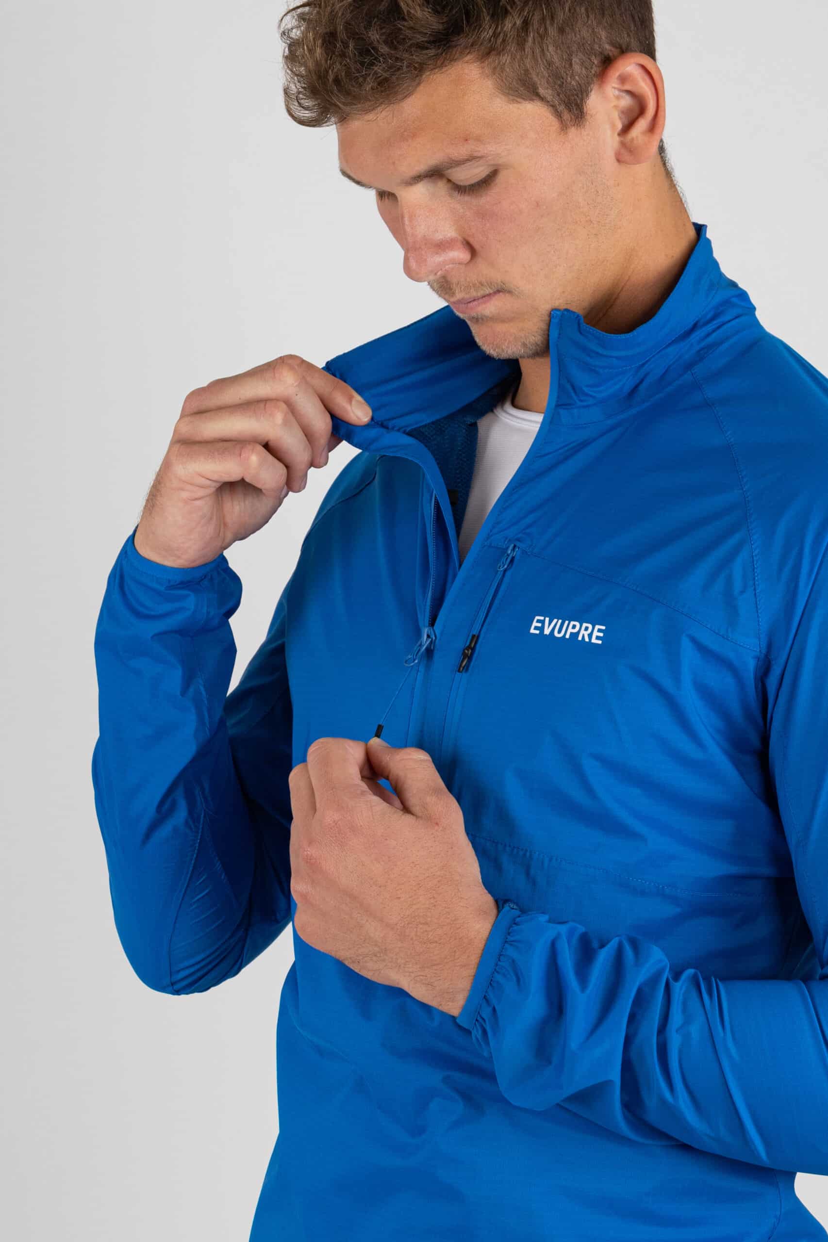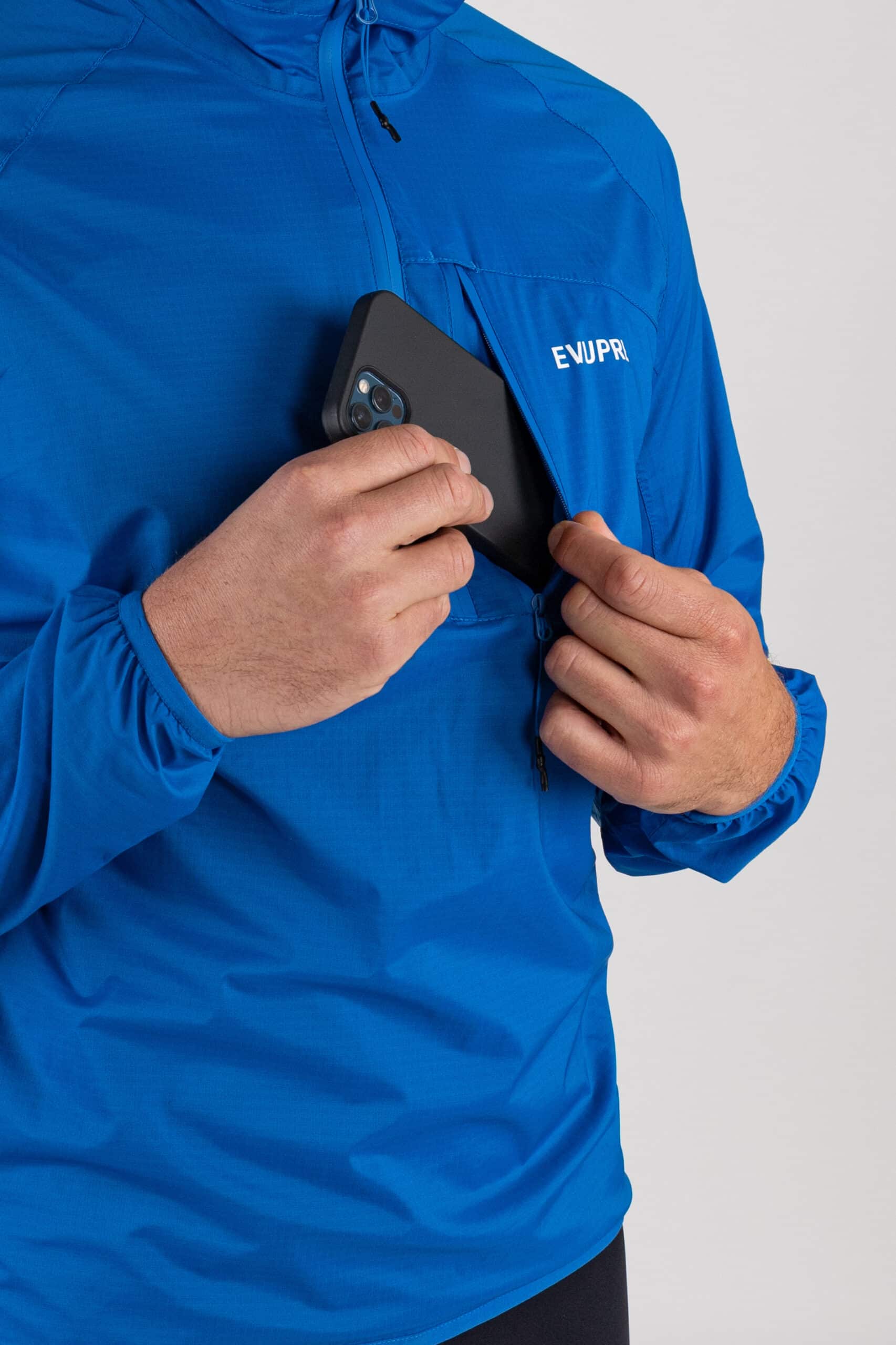 Die Farblogik des Protect Anorak 3.0 aus luxuriösem Royalblau mit dezenten weißen EVUPRE Logos ergibt einen sportlich-eleganten Look mit Wiedererkennungswert.