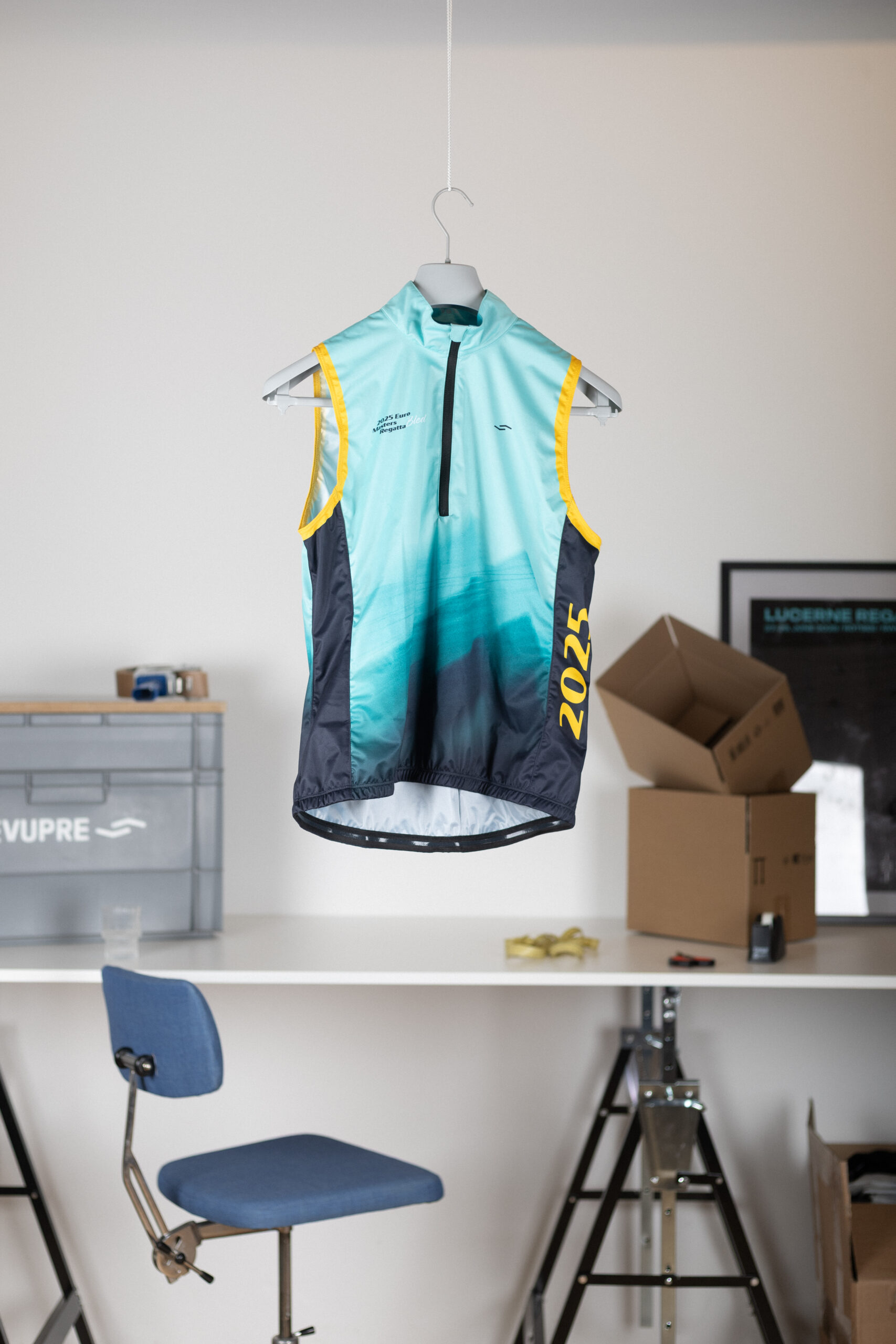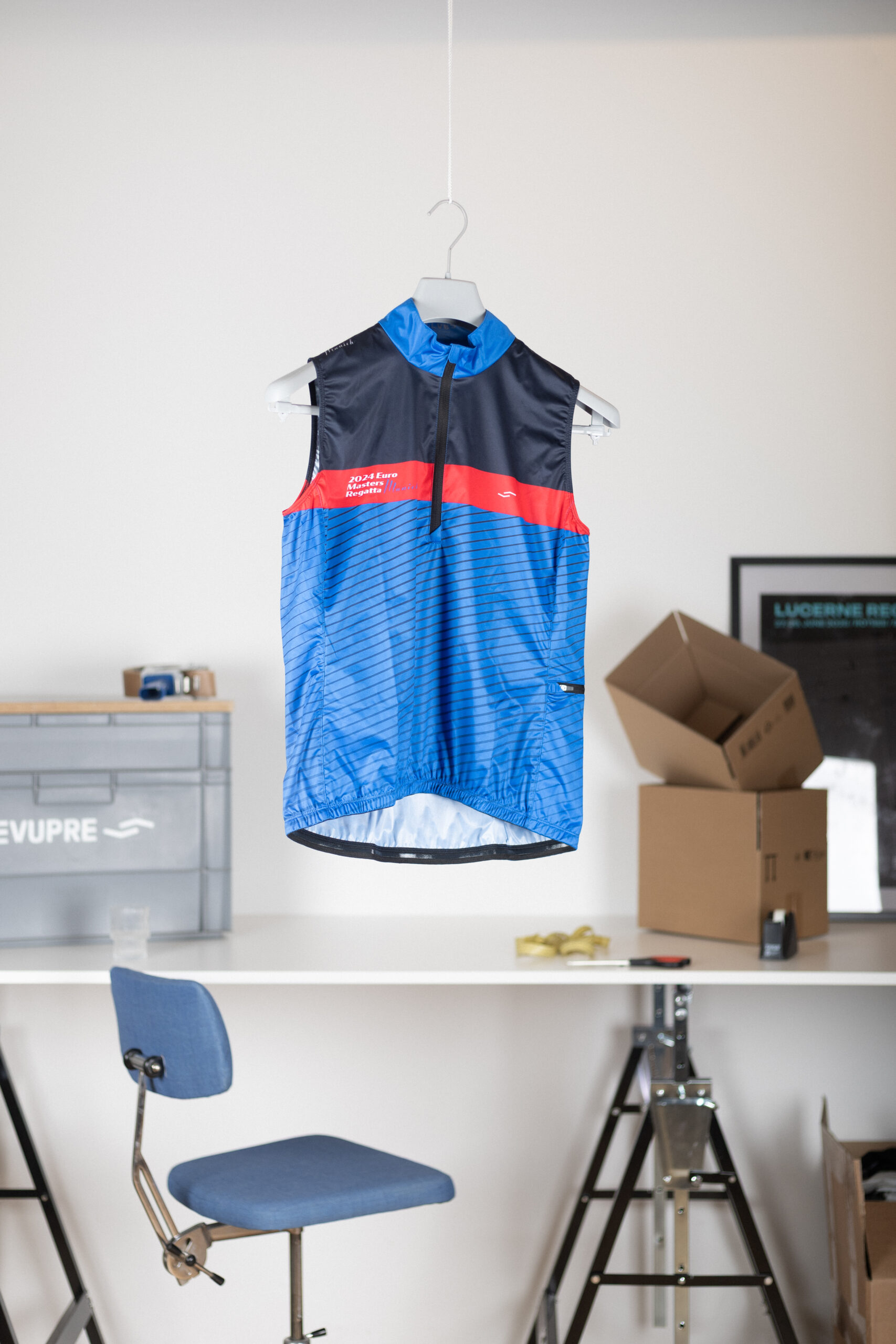 Die Thermo Weste in Marineblau wird von einem naturweißen Seitenstreifen akzentuiert. Dieser trägt die französischen Starterkommandos „Êtes-vous prêts?” auf der einen und „Partez!” auf der anderen Seite – eine stilvolle Hommage an die internationale Ruderszene, die Funktion mit Design verbindet.